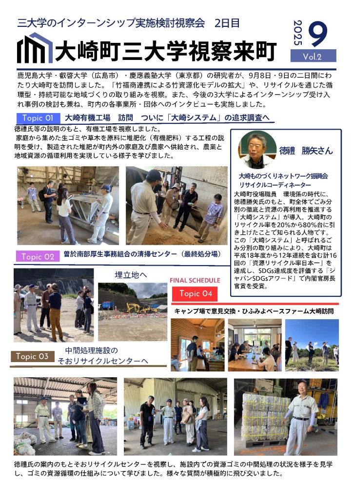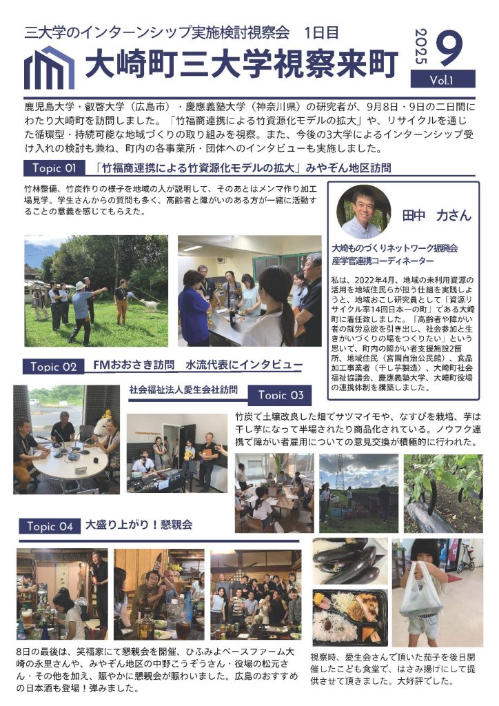 このモデルは、多様な主体との協働により持続可能なモデルを構築し,大崎町から薩摩川内市へ展開しています。「弱さ」の相互理解を通じた包摂空間を創出し,関係人口の拡大やひきこもりの方の一般就労実現など,共生社会の具体的実践事例として、3大学による合同視察を行います。