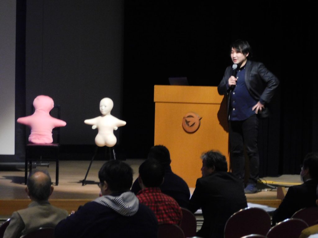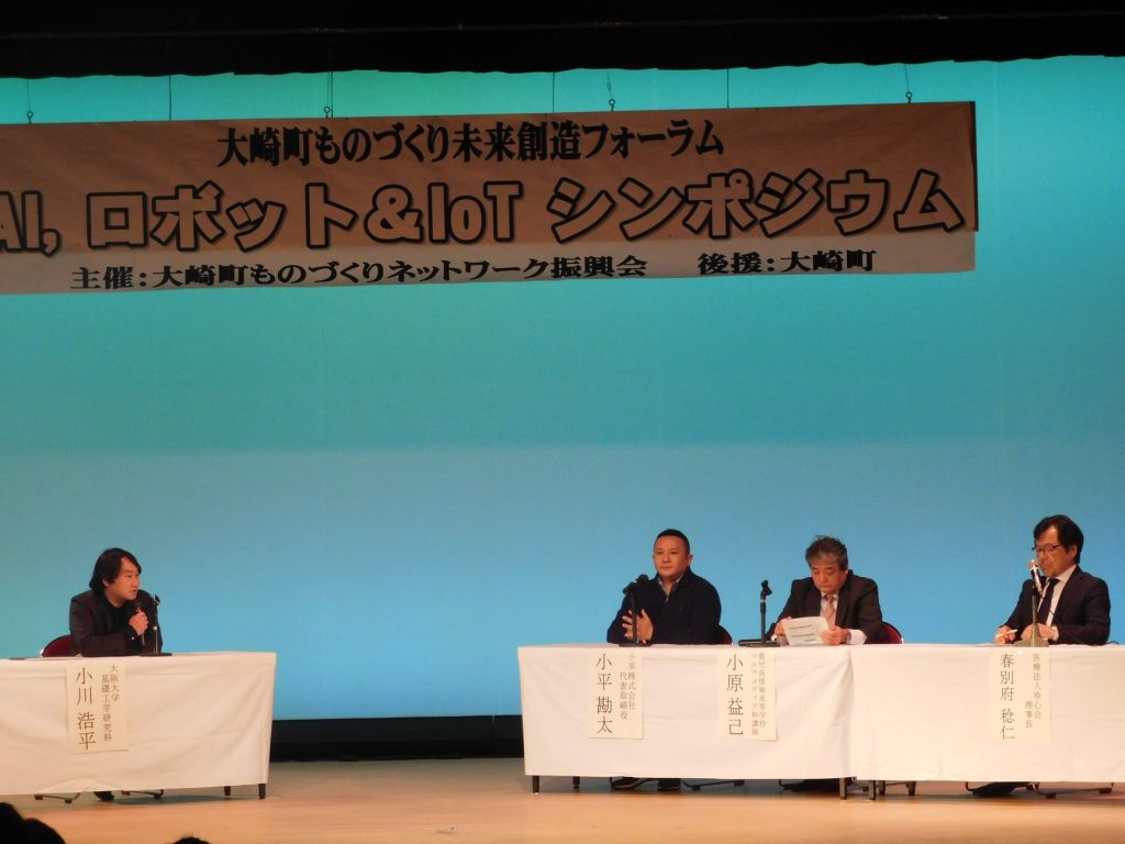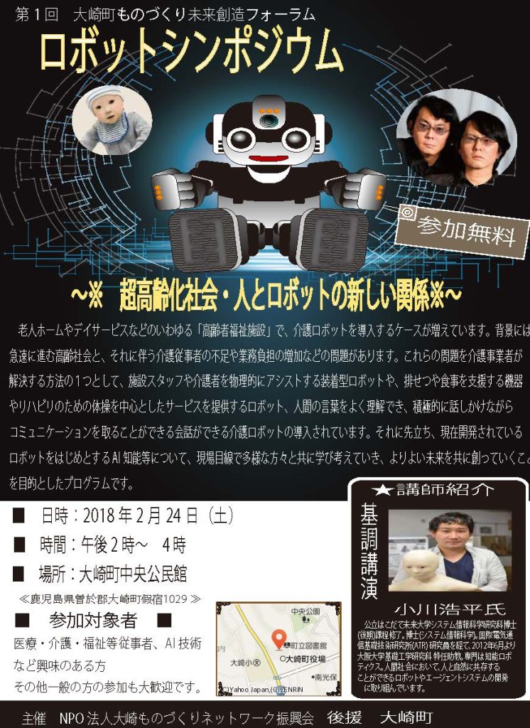 2月24日(土)、大崎町中央公民館において、NPO法人大崎ものづくりネットワーク振興会が主催する『AI,ロボット,IoTシンポジウム』が開催されました。 シンポジウムは、大阪大学基礎工学研究科講師の小川浩平さんによる講演、農業・教育・介護現場の視点から見た人とロボットの新しい関係について紹介が行われ、参加者らは真剣に聞き入っていました。